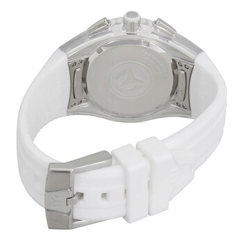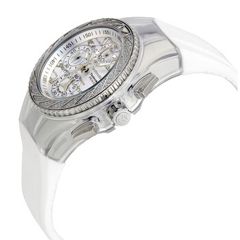 Stainless steel case with a white silicone strap. Fixed stainless steel set with crystals bezel. Silver dial with silver-tone hands and index hour markers. Minute markers around the outer rim. Dial Type: Analog. Luminescent hands and markers. Date display between 4 and 5 o'clock position. Chronograph - three sub-dials displaying: 60 second, 60 minute and 1/10th of a second. Hattori caliber VD57 quartz movement. Scratch resistant mineral crystal. Screw down crown. Solid case back. Case size: 37 mm. Case thickness: 14 mm. Round case shape. Band width: 24 mm. Tang clasp. Water resistant at 200 meters / 660 feet. Functions: chronograph, date, hour, minute, second. Additional Info: in general, suitable for professional marine activity and serious surface water sports, but not diving. Sport watch style. Technomarine Cruise Chronograph Ladies Watch 115383.