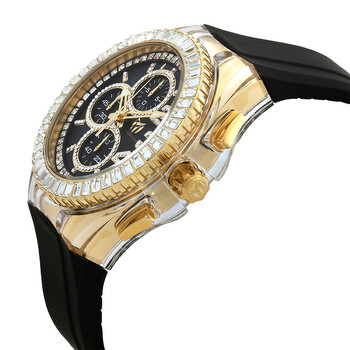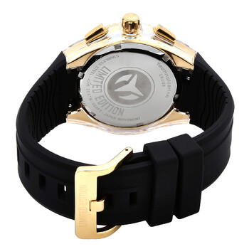 Gold-tone stainless steel case with a black silicone strap. Fixed gold-tone bezel with crystal set. Black dial with gold-tone hands and index-Arabic numeral hour markers. Minute markers around the outer rim. Dial Type: Analog. Luminescent hands and markers. Chronograph - three sub-dials displaying: 60 second, 60 minute and 1/10th of a second. VD55 quartz movement. Scratch resistant Flame Fusion crystal. Pull / push crown. Solid case back. Round case shape, case size: 45 mm, case thickness: 14 mm. Band width: 29 mm, band length: 8 inches. Buckle clasp. Water resistant at 200 meters / 660 feet. Functions: chronograph, hour, minute, second. Cruise Series. Sport watch style. Watch label: Japan Movt. Technomarine Cruise Chronograph Quartz Crystal Black Dial Unisex Watch TM-121027.