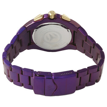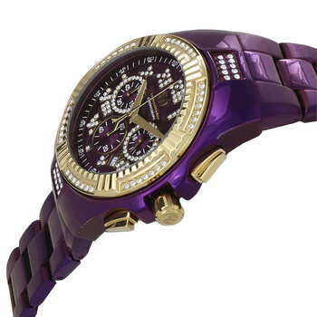 Purple stainless steel case and bracelet. Fixed gold-tone stainless steel bezel set with crystals. Purple dial with gold-tone hands and Roman numeral hour markers. Arabic numeral minute markers (at 5 minute intervals). Dial Type: Analog. Date display between 4 and 5 o'clock position. Chronograph - three sub-dials displaying: 60 second, 60 minute and 24 hour. TMI Caliber VD53B-14 quartz movement. Scratch resistant Flame Fusion crystal. Pull / push crown. Solid case back. Round case shape, case size: 44.5 mm. Band width: 29 mm. Foldover clasp. Water resistant at 100 meters / 330 feet. Functions: chronograph, date, hour, minute, second. Cruise Series. Sport watch style. Watch label: Japan Movt. Technomarine Cruise Chronograph Quartz Crystal Purple Dial Men's Watch TM-121235.