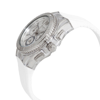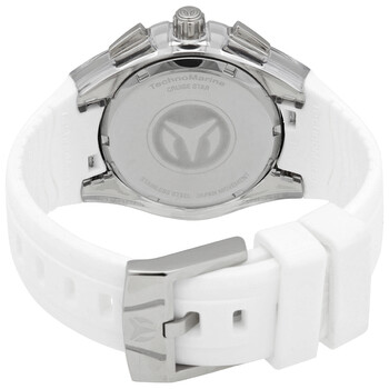 Stainless steel case with a white silicone strap. Uni-directional rotating stainless steel bezel. Silver dial with luminous silver-tone hands and index hour markers. Arabic numeral minute markers (at 5 minute intervals). Minute markers around the outer rim. Luminescent hands and markers. Date display between the 4 and 5 o'clock positions. Caliber VD53 quartz movement. Scratch resistant mineral crystal. Screw down crown. Solid case back. Round case shape. Case size: 40.57 mm. Case thickness: 13.65 mm. Band width: 26 mm. Band length: 7.75 inches. Tang clasp. Water resistant at 200 meters / 660 feet. Functions: chronograph, date, hour, minute, second. Cruise Series. Casual watch style. Technomarine Cruise Chronograph Quartz Silver Dial Ladies Watch TM-120033.