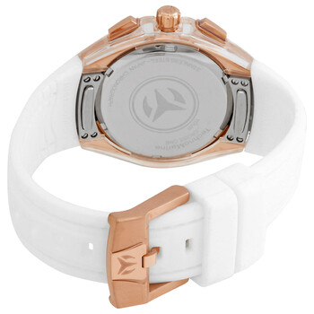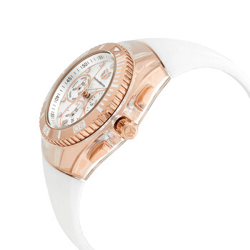 Rose gold-tone stainless steel case with a white silicone strap. Uni-directional rotating rose gold-tone stainless steel bezel. White dial with gold-tone hands and index hour markers. Minute markers around the outer rim. Dial Type: Analog. Date display at the 6 o'clock position. Chronograph - three sub-dials displaying: 60 second, 60 minute and 24 hour. Hattori Caliber VD53 quartz movement. Scratch resistant sapphire crystal. Pull / push crown. Solid case back. Round case shape, case size: 40 mm, case thickness: 14 mm. Band width: 26 mm, band length: 7.25 inches. Tang clasp. Water resistant at 200 meters / 660 feet. Functions: chronograph, date, GMT, second time zone, hour, minute, second. Cruise Series. Sport watch style. Watch label: Japan Movt. Technomarine Cruise Chronograph Quartz White Dial Ladies Watch TM-120047.