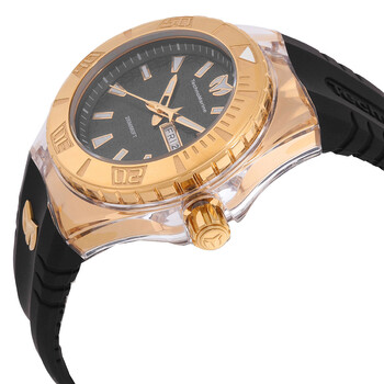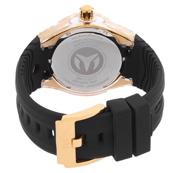 Gold-tone stainless steel case with a black silicone strap. Uni-directional rotating gold-tone stainless steel bezel. Black dial with gold-tone hands and index hour markers. Minute markers around the outer rim. Dial Type: Analog. Luminescent hands and markers. Day of the week and date display at the 3 o'clock position. PC33 quartz movement. Scratch resistant mineral crystal. Screw down crown. Solid case back. Round case shape, case size: 47.8 mm, case thickness: 14.7 mm. Band width: 29.0 mm, band length: 8.25 inches. Buckle clasp. Water resistant at 200 meters / 660 feet. Functions: date, day, hour, minute, second. Cruise Series. Casual watch style. Watch label: Japan Movt. Technomarine Cruise Date Day Quartz Black Dial Men's Watch TM-122011.