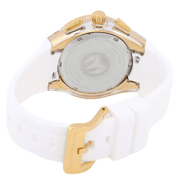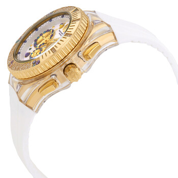 Gold-tone stainless steel case with a white silicone strap. Gold-tone stainless steel bezel. White dial with gold-tone hands and crystal hour markers. Minute markers around the outer rim. Dial Type: Analog. Date display between 4 and 5 o'clock position. Chronograph - three sub-dials displaying: 60 second, 60 minute and 24 hour. TMI Caliber YM12 quartz movement. Scratch resistant Flame Fusion crystal. Pull / push crown. Solid case back. Round case shape, case size: 40 mm, case thickness: 16 mm. Band width: 26 mm, band length: 7.50 inches. Buckle clasp. Water resistant at 100 meters / 330 feet. Functions: date, GMT, second time zone, hour, minute, second. Cruise Series. Casual watch style. Watch label: Japan Movt. Technomarine Cruise GMT Quartz Crystal White Dial Unisex Watch TM-121004.