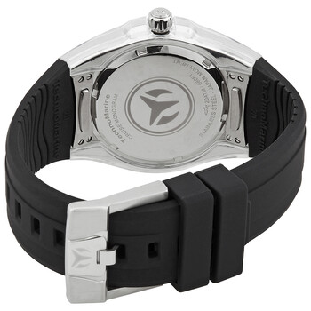 Silver-tone stainless steel case with a black silicone strap. Uni-directional rotating silver-tone stainless steel bezel. Black dial with silver-tone hands and index-Arabic numeral hour markers. Minute markers around the outer rim. Dial Type: Analog. Hattori Caliber PC21 quartz movement. Scratch resistant Flame Fusion crystal. Solid case back. Round case shape, case size: 42 mm, case thickness: 13.1 mm. Band width: 29 mm, band length: 8.25 inches. Tang clasp. Water resistant at 200 meters / 660 feet. Functions: hour, minute, second. Cruise Monogram Series. Casual watch style. Watch label: Japan Movt. TechnoMarine Cruise Monogram Quartz Black Dial Ladies Watch TM-121249.