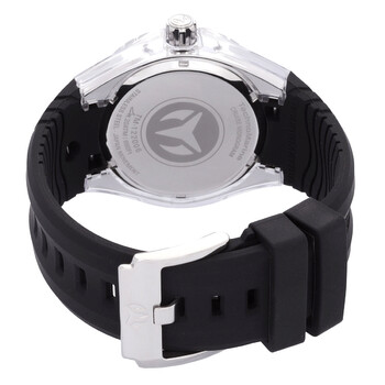 Silver-tone stainless steel case with a black silicone strap. Uni-directional rotating silver-tone stainless steel bezel. Black dial with silver-tone hands and index hour markers. Minute markers around the outer rim. Dial Type: Analog. Luminescent hands and markers. Day of the week and date display at the 3 o'clock position. Hattori Caliber PC33 quartz movement. Scratch resistant mineral crystal. Screw down crown. Solid case back. Round case shape, case size: 47.8 mm, case thickness: 14.7 mm. Band width: 29.00 mm, band length: 8.25 inches. Buckle clasp. Water resistant at 200 meters / 660 feet. Functions: date, day, hour, minute, second. Cruise Series. Casual watch style. Watch label: Japan Movt. Technomarine Cruise Monogram Quartz Black Dial Men's Watch TM-122006.
