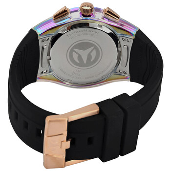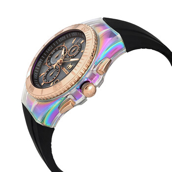 Iridescent PVD stainless steel case with a black silicone strap. Uni-directional rotating rose gold PVD bezel. Grey dial with luminous rose gold-tone hands and index hour markers. Arabic numeral minute markers (at 5 minute intervals). Minute markers around the outer rim. Dial Type: Analog. Luminescent hands and markers. Date display between the 4 and 5 o'clock positions. Chronograph - three sub-dials displaying: 60 second, 60 minute and 1/10th of a second. Hattori caliber VD57 quartz movement. Scratch resistant mineral crystal. Screw down crown. Solid case back. Round case shape. Case size: 45 mm. Case thickness: 13 mm. Band width: 29 mm. Tang clasp. Water resistant at 200 meters / 660 feet. Functions: chronograph, date, hour, minute, second. Cruise Original Series. Sport watch style. Technomarine Cruise Original Chronograph Grey Dial Men's Watch 115367.