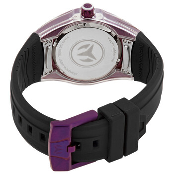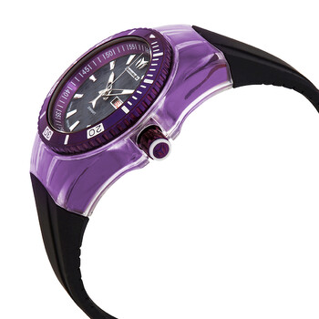 Purple stainless steel case with a black silicone strap. White and purple stainless steel bezel. Black dial with silver-tone hands and index hour markers. Minute markers around the outer rim. Dial Type: Analog. Luminescent hands and markers. Day of the week and date display at the 3 o'clock position. Hattori Caliber PC33 quartz movement. Scratch resistant Flame Fusion crystal. Pull / push crown. Solid case back. Round case shape, case size: 40 mm, case thickness: 14 mm. Band width: 24 mm, band length: 8 inches. Buckle clasp. Water resistant at 200 meters / 660 feet. Functions: date, day, hour, minute, second. Cruise Series. Casual watch style. Watch label: Japan Movt. Technomarine Cruise Quartz Black Dial Ladies Watch TM-621023.