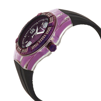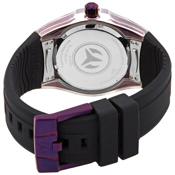 Purple stainless steel case with a black silicone strap. Fixed purple stainless steel bezel. Purple dial with silver-tone hands and crystal index-Arabic numeral hour markers. Minute markers around the outer rim. Dial Type: Analog. Ronda Caliber 763 quartz movement. Scratch resistant Flame Fusion crystal. Pull / push crown. Solid case back. Round case shape, case size: 44.5 mm, case thickness: 13.3 mm. Band width: 29 mm, band length: 8.25 inches. Buckle clasp. Water resistant at 100 meters / 330 feet. Functions: hour, minute, second. Cruise Series. Casual watch style. Watch label: Swiss Movt. Technomarine Cruise Quartz Crystal Purple Dial Men's Watch TM-121224.