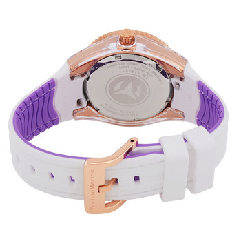 Rose gold-tone stainless steel case with a white (purple back) silicone strap. Uni-directional rotating rose gold-tone bezel set with zirconia crystals. Mother of pearl dial with rose gold-tone hands. Arabic numeral minute markers (at 5 minute intervals). Dial Type: Analog. Hattori caliber PC21 quartz movement. Scratch resistant Flame Fusion crystal. Pull / push crown. Solid case back. Round case shape. Case size: 40 mm. Case thickness: 16 mm. Band width: 26 mm. Band length: 7 inches. Tang clasp. Water resistant at 100 meters / 330 feet. Functions: hour, minute, second. Cruise Series. Casual watch style. Watch label: Japan Movt. Technomarine Cruise Quartz Mother of Pearl Dial Ladies Watch TM-119021.