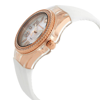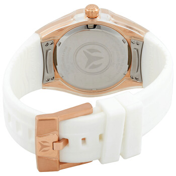 Rose gold-tone stainless steel case with a white silicone strap. Uni-directional rotating rose gold-tone stainless steel bezel. White mother of pearl dial with rose gold-tone hands and index-Arabic numeral hour markers. Minute markers around the outer rim. Dial Type: Analog. Luminescent hands and markers. Hattori Caliber PC21 quartz movement. Scratch resistant Flame Fusion crystal. Pull / push crown. Solid case back. Round case shape, case size: 42 mm, case thickness: 13.1 mm. Band width: 29 mm, band length: 8.25 inches. Tang clasp. Water resistant at 200 meters / 660 feet. Functions: hour, minute, second. Cruise Series. Casual watch style. Watch label: Japan Movt. Technomarine Cruise Quartz White Mother of Pearl Dial Ladies Watch TM-121258.
