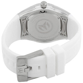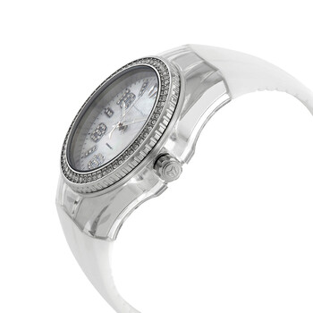 Silver-tone stainless steel case with a white silicone strap. Uni-directional rotating silver-tone stainless steel bezel. White mother of pearl dial with silver-tone hands and index-Arabic numeral hour markers. Minute markers around the outer rim. Dial Type: Analog. Hattori Caliber PC21 quartz movement. Scratch resistant Flame Fusion crystal. Solid case back. Round case shape, case size: 42 mm, case thickness: 13.1 mm. Band width: 29 mm, band length: 8.25 inches. Tang clasp. Water resistant at 200 meters / 660 feet. Functions: hour, minute, second. Cruise Series. Casual watch style. Watch label: Japan Movt. TechnoMarine Cruise Quartz White Mother of Pearl Dial Ladies Watch TM-121260.