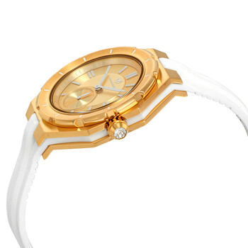 Gold-tone stainless steel case with a white silicone strap. Fixed gold-tone stainless steel bezel. Gold dial with luminous silver-tone hands and index hour markers. Minute markers around the outer rim. Dial Type: Analog. Luminescent hands. Small seconds sub-dial. Ronda caliber 1069 quartz movement. Scratch resistant Flame Fusion crystal. Pull / push crown. Solid case back. Round case shape. Case size: 37.5 mm. Case thickness: 9.4 mm. Band width: 17 mm. Tang clasp. Water resistant at 100 meters / 330 feet. Functions: hour, minute, small second. Cruise Sea Series. Casual watch style. Watch label: Swiss Movt. Technomarine Cruise Sea Gold Dial Ladies Watch TM-118005.