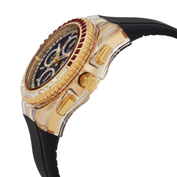 Gold-tone stainless steel case with a black silicone strap. Fixed gold-tone bezel with crystal set. Black dial with gold-tone hands and crystal-set index hour markers. Crystal-set arabic numerals appear at the 2, 3 and 4 o'clock positions. Dial Type: Analog. Luminescent hands. Chronograph - three sub-dials displaying: 60 second, 60 minute and 1/10th of a second. Caliber Hattori VD55 quartz movement. Scratch resistant Flame Fusion crystal. Pull / push crown. Solid case back. Round case shape, case size: 40 mm, case thickness: 14 mm. Band width: 26 mm, band length: 7.25 inches. Tang clasp. Water resistant at 200 meters / 660 feet. Functions: chronograph, hour, minute, second. Cruise Star Series. Sport watch style. Watch label: Japan Movt. Technomarine Cruise Star Chronograph Quartz Crystal Black Dial Ladies Watch TM-121050.