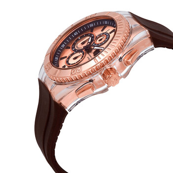 Rose gold-tone stainless steel case with a brown rubber strap. Uni-directional rotating rose gold-tone bezel. Rose dial with luminous hands and index hour markers. Arabic numeral minute markers (at 5 minute intervals). Minute markers around the outer rim. Dial Type: Analog. Luminescent hands and markers. Date display at the 4 o'clock position. Three sub-dials displaying: 60 second, 12 hour and 1/10th of a second. Quartz movement. Scratch resistant mineral crystal. Screw down crown. Solid case back. Case diameter: 45 mm. Case thickness: 14 mm. Round case shape. Band width: 24 mm. Tang clasp. Water resistant at 200 meters / 660 feet. Functions: chronograph, date, hour, minute, second. Sport watch style. Technomarine Cruise Star Rose Dial Brown Silicone Men's Watch 115217.