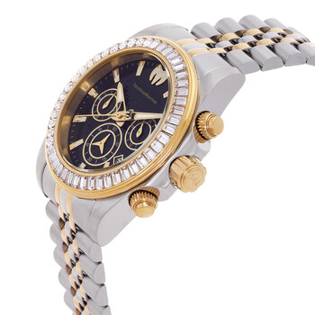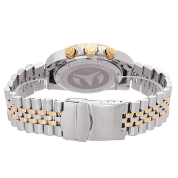 Two-tone (steel and gold) stainless steel case with a gold, steel stainless steel bracelet. Fixed gold-tone bezel with crystal set. Black dial with gold-tone hands and index hour markers. Minute markers around the outer rim. Dial Type: Analog. Luminescent hands and markers. Date display between 4 and 5 o'clock position. Chronograph - three sub-dials displaying: 60 second, 60 minute and 24 hour. Hattori Caliber VD53 quartz movement. Scratch resistant mineral crystal. Screw down crown. Solid case back. Round case shape, case size: 42 mm, case thickness: 13 mm. Band width: 22 mm, band length: 8.25 inches. Fold over clasp. Water resistant at 200 meters / 660 feet. Functions: chronograph, date, GMT, second time zone, hour, minute, second. Manta Series. Sport watch style. Watch label: Japan Movt. Technomarine Manta Chronograph GMT Quartz Crystal Black Dial Men's Watch TM-222041.