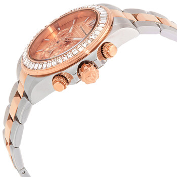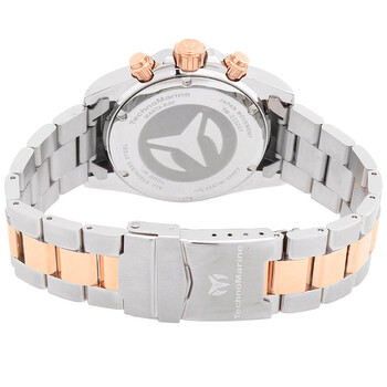 Two-tone (steel and rose gold) stainless steel case with a two-tone (silver-tone and rose gold-tone) stainless steel bracelet. Fixed rose gold-tone bezel with crystal set. Rose gold-tone dial with rose gold-tone hands and index hour markers. Minute markers around the outer rim. Dial Type: Analog. Luminescent hands and markers. Date display between 4 and 5 o'clock position. Chronograph - three sub-dials displaying: 60 second, 60 minute and 24 hour. Hattori Caliber VD53 quartz movement. Scratch resistant mineral crystal. Screw down crown. Solid case back. Round case shape, case size: 42 mm, case thickness: 13.1 mm. Band width: 22 mm, band length: 8.25 inches. Fold over clasp. Water resistant at 200 meters / 660 feet. Functions: chronograph, date, GMT, second time zone, hour, minute, second. Manta Series. Sport watch style. Watch label: Japan Movt. Technomarine Manta Chronograph GMT Quartz Crystal Rose Gold Dial Men's Watch TM-222007.