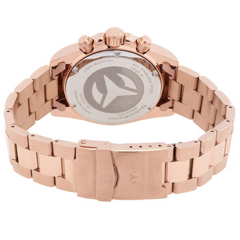 Rose gold-tone stainless steel case and bracelet. Fixed rose gold-tone bezel with crystal set. Rose gold-tone dial with rose gold-tone hands and index hour markers. Minute markers around the outer rim. Dial Type: Analog. Luminescent hands and markers. Date display between 4 and 5 o'clock position. Chronograph - three sub-dials displaying: 60 second, 60 minute and 24 hour. Hattori Caliber VD53 quartz movement. Scratch resistant mineral crystal. Screw down crown. Solid case back. Round case shape, case size: 42 mm, case thickness: 13.1 mm. Band width: 22 mm, band length: 8.25 inches. Fold over clasp. Water resistant at 200 meters / 660 feet. Functions: chronograph, date, GMT, second time zone, hour, minute, second. Manta Series. Sport watch style. Watch label: Japan Movt. Technomarine Manta Chronograph GMT Quartz Crystal Rose Gold Dial Men's Watch TM-222008.
