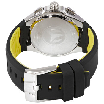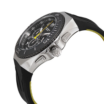 Stainless steel case with a black (yellow backed) silicone strap. Uni-directional rotating black PVD bezel. Black dial with luminous silver-tone hands and Roman numera and Arabic numeral hour markers. Arabic numeral minute markers (at 5 minute intervals). Minute markers around the outer rim. Dial Type: Analog. Luminescent hands. Date display between the 4 and 5 o'clock positions. Chronograph - three sub-dials displaying: 60 second, 60 minute and 24 hour. Hattori caliber VD53 quartz movement. Scratch resistant mineral crystal. Pull / push crown. Solid case back. Round case shape. Case size: 48 mm. Case thickness: 13.5 mm. Band width: 31 mm. Band length: 8.25 inches. Tang clasp. Water resistant at 200 meters / 660 feet. Functions: chronograph, date, GMT, second time zone, hour, minute, second. Manta Series. Sport watch style. Watch label: Japan Movt. Technomarine Manta Chronograph Quartz Black Dial Men's Watch TM-215068.