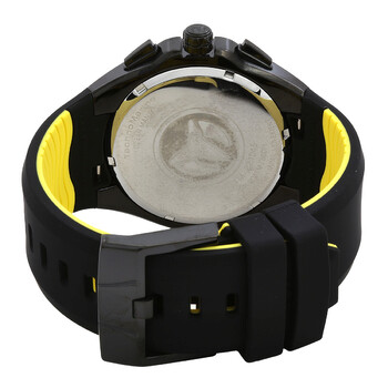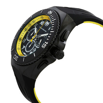 Black stainless steel case with a yellow, black silicone strap. Uni-directional rotating black stainless steel bezel. Black dial with silver-tone hands and Arabic numeral-Roman numeral hour markers. Minute markers around the outer rim. Dial Type: Analog. Date display between 4 and 5 o'clock position. Chronograph - three sub-dials displaying: 60 second, 60 minute and 24 hour. VD53 quartz movement. Scratch resistant mineral crystal. Screw down crown. Solid case back. Round case shape, case size: 48 mm, case thickness: 13.5 mm. Band width: 31 mm, band length: 8.25 inches. Buckle clasp. Water resistant at 200 meters / 660 feet. Functions: chronograph, date, hour, minute, second. Manta Series. Sport watch style. Watch label: Japan Movt. Technomarine Manta Chronograph Quartz Black Dial Men's Watch TM-221045.