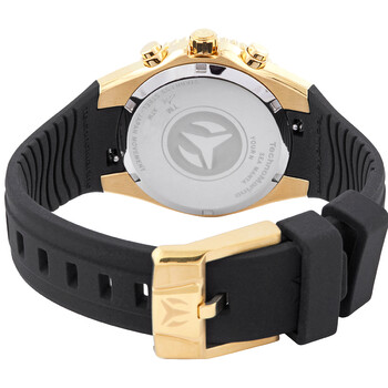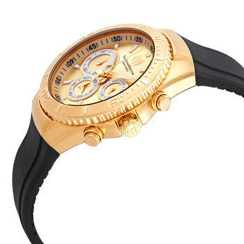 Gold-tone stainless steel case with a black silicone strap. Uni-directional rotating gold-tone bezel. Gold dial with luminous gold-tone dauphine-style hands and index hour markers. Arabic numeral minute markers (at 5 minute intervals). Minute markers around the outer rim. Dial Type: Analog. Luminescent hands and markers. Chronograph - three sub-dials displaying: 60 second, 60 minute and 24 hour. Hattori caliber VD54 quartz movement. Scratch resistant Flame Fusion crystal. Pull / push crown. Solid case back. Round case shape. Case size: 40 mm. Case thickness: 13 mm. Band width: 26 mm. Band length: 7.75 inches. Tang clasp. Water resistant at 200 meters / 660 feet. Functions: chronograph, GMT, second time zone, hour, minute, second. Manta Series. Sport watch style. Watch label: Japan Movt. Technomarine Manta Chronograph Quartz Gold Dial Ladies Watch TM-218035.
