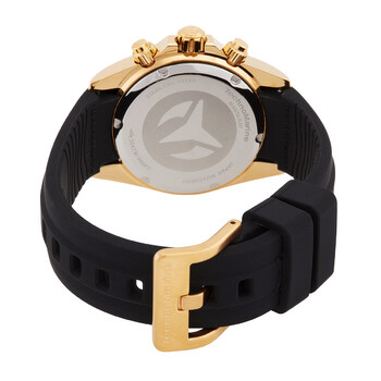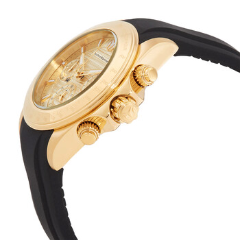 Gold-tone stainless steel case with a black silicone strap. Fixed gold-tone stainless steel bezel. Gold-tone dial with gold-tone hands and index hour markers. Minute markers around the outer rim. Dial Type: Analog. Luminescent hands and markers. Date display between 4 and 5 o'clock position. Chronograph - three sub-dials displaying: 60 second, 60 minute and 24 hour. Hattori Caliber VD53 quartz movement. Scratch resistant sapphire crystal. Screw down crown. Solid case back. Round case shape, case size: 38 mm, case thickness: 13 mm. Band width: 20 mm, band length: 7.25 inches. Pin buckle clasp. Water resistant at 200 meters / 660 feet. Functions: chronograph, date, GMT, second time zone, hour, minute, second. Manta Series. Sport watch style. Watch label: Japan Movt. Technomarine Manta Chronograph Quartz Gold Dial Ladies Watch TM-219041.