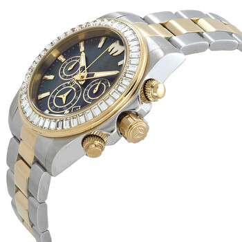 Silver-tone stainless steel case with a two-tone (silver-tone and yellow gold-tone) stainless steel bracelet. Fixed yellow gold-tone stainless steel bezel. Black dial with yellow gold-tone hands and index hour markers. Minute markers around the outer rim. Dial Type: Analog. Luminescent hands and markers. Date display between 4 and 5 o'clock position. Chronograph - three sub-dials displaying: 60 second, 60 minute and 24 hour. TMI Caliber VD53B-14 quartz movement. Scratch resistant mineral crystal. Screw down crown. Solid case back. Round case shape, case size: 42 mm. Band width: 22 mm. Fold over clasp. Water resistant at 200 meters / 660 feet. Functions: chronograph, date, GMT, second time zone, hour, minute, second. Manta Ray Series. Sport watch style. Watch label: Japan Movt. Technomarine Manta Ray Chronograph GMT Quartz Black Dial Men's Watch TM-222036.