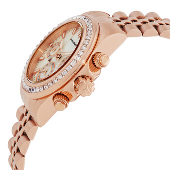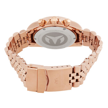 Rose gold-tone stainless steel case and bracelet. Fixed rose gold-tone bezel with crystal set. White dial with rose gold-tone hands and index hour markers. Minute markers around the outer rim. Dial Type: Analog. Luminescent hands and markers. Date display between 4 and 5 o'clock position. Chronograph - three sub-dials displaying: 60 second, 60 minute and 24 hour. Hattori Caliber VD53 quartz movement. Scratch resistant mineral crystal. Screw down crown. Solid case back. Round case shape, case size: 38 mm, case thickness: 13 mm. Band width: 20 mm, band length: 7.75 inches. Fold over clasp. Water resistant at 200 meters / 660 feet. Functions: chronograph, date, GMT, second time zone, hour, minute, second. Manta Series. Sport watch style. Watch label: Japan Movt. Technomarine Manta Ray Chronograph GMT Quartz Crystal White Dial Ladies Watch TM-222057.