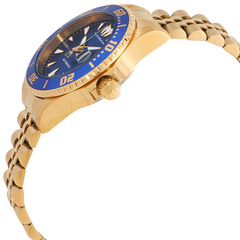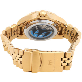 Gold-tone stainless steel case and bracelet. Uni-directional rotating gold-tone stainless steel bezel with an inlaid blue ring. Blue dial with gold-tone hands and index hour markers. Minute markers around the outer rim. Dial Type: Analog. Luminescent hands and markers. Date display at the 3 o'clock position. Caliber NH35A automatic movement. Scratch resistant Flame Fusion crystal. Screw down crown. Transparent case back. Round case shape, case size: 38 mm. Band width: 20 mm. Fold over clasp with a safety release. Water resistant at 200 meters / 660 feet. Functions: date, hour, minute, second. Manta Sea Series. Sport watch style. Watch label: Japan Movt. Technomarine Manta Sea Automatic Blue Dial Ladies Watch TM-219064.