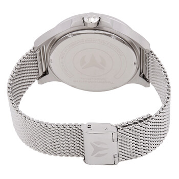 Silver-tone stainless steel case with a silver-tone stainless steel mesh bracelet. Fixed silver-tone stainless steel bezel. Blue dial with silver-tone hands and index hour markers. Minute markers around the outer rim. Dial Type: Analog. Date display at the 3 o'clock position. PC32 quartz movement. Scratch resistant mineral crystal. Pull / push crown. Solid case back. Round case shape, case size: 45 mm, case thickness: 11.00 mm. Band width: 20 mm, band length: 7.75 inches. Fold over clasp. Water resistant at 30 meters / 100 feet. Functions: date, hour, minute, second. Moonsun Series. Casual watch style. Watch label: Japan Movt. Technomarine MoonSun Date Quartz Blue Dial Men's Watch TM-822004.