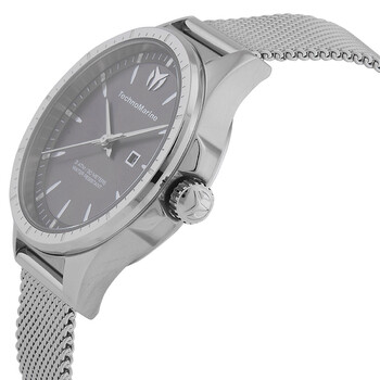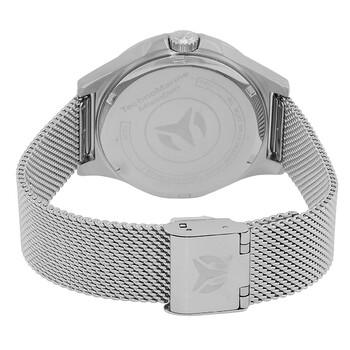 Silver-tone stainless steel case with a silver-tone stainless steel mesh bracelet. Fixed silver-tone stainless steel bezel. Charcoal dial with silver-tone hands and index hour markers. Minute markers around the outer rim. Dial Type: Analog. Date display at the 3 o'clock position. PC22A quartz movement. Scratch resistant mineral crystal. Pull / push crown. Solid case back. Round case shape, case size: 36 mm, case thickness: 10.00 mm. Band width: 16 mm, band length: 7.75 inches. Fold over clasp. Water resistant at 30 meters / 100 feet. Functions: date, hour, minute, second. Moonsun Series. Casual watch style. Watch label: Japan Movt. Technomarine MoonSun Date Quartz Charcoal Dial Ladies Watch TM-822033.