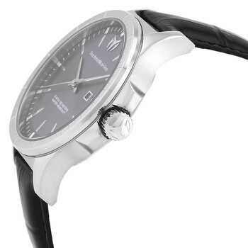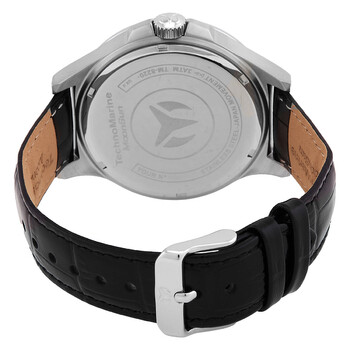 Silver-tone stainless steel case with a black leather strap. Fixed silver-tone stainless steel bezel. Charcoal dial with silver-tone hands and index hour markers. Minute markers around the outer rim. Dial Type: Analog. Date display at the 3 o'clock position. PC32 quartz movement. Scratch resistant mineral crystal. Pull / push crown. Solid case back. Round case shape, case size: 45 mm, case thickness: 11.00 mm. Band width: 20 mm, band length: 8.50 inches. Buckle clasp. Water resistant at 30 meters / 100 feet. Functions: date, hour, minute, second. Moonsun Series. Casual watch style. Watch label: Japan Movt. Technomarine MoonSun Date Quartz Charcoal Dial Men's Watch TM-822011.