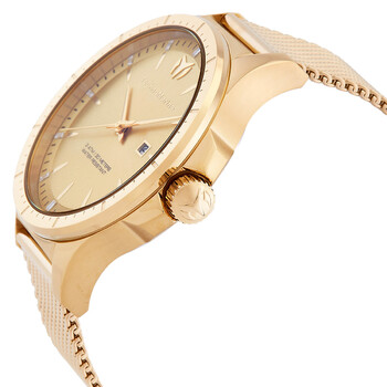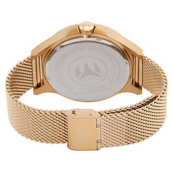 Gold-tone stainless steel case with a gold-tone stainless steel mesh bracelet. Fixed gold-tone stainless steel bezel. Gold-tone dial with gold-tone hands and index hour markers. Minute markers around the outer rim. Dial Type: Analog. Date display at the 3 o'clock position. PC32 quartz movement. Scratch resistant mineral crystal. Pull / push crown. Solid case back. Round case shape, case size: 45 mm, case thickness: 11.00 mm. Band width: 20 mm, band length: 7.75 inches. Fold over clasp. Water resistant at 30 meters / 100 feet. Functions: date, hour, minute, second. Moonsun Series. Casual watch style. Watch label: Japan Movt. Technomarine MoonSun Date Quartz Gold Dial Men's Watch TM-822009.