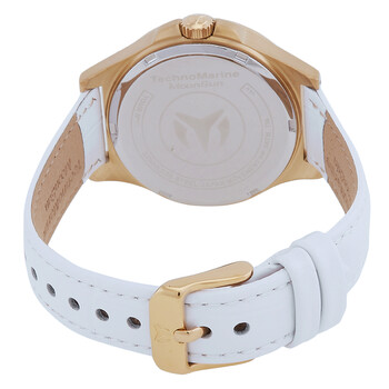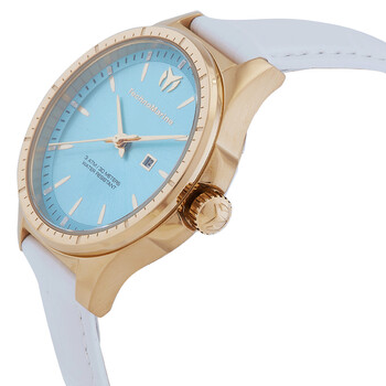 Gold-tone stainless steel case with a white leather strap. Fixed gold-tone stainless steel bezel. Light blue dial with gold-tone hands and index hour markers. Minute markers around the outer rim. Dial Type: Analog. Date display at the 3 o'clock position. PC22A quartz movement. Scratch resistant mineral crystal. Pull / push crown. Solid case back. Round case shape, case size: 36 mm, case thickness: 10.00 mm. Band width: 16 mm, band length: 7.75 inches. Buckle clasp. Water resistant at 30 meters / 100 feet. Functions: date, hour, minute, second. Moonsun Series. Casual watch style. Watch label: Japan Movt. Technomarine MoonSun Date Quartz Light Blue Dial Dial Ladies Watch TM-822046.