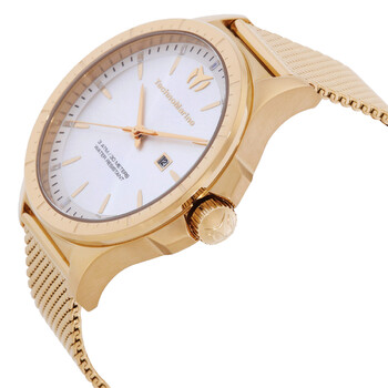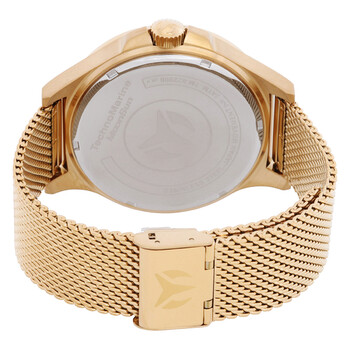 Gold-tone stainless steel case with a gold-tone stainless steel mesh bracelet. Fixed gold-tone stainless steel bezel. Silver-tone dial with gold-tone hands and index hour markers. Minute markers around the outer rim. Dial Type: Analog. Date display at the 3 o'clock position. PC32 quartz movement. Scratch resistant mineral crystal. Pull / push crown. Solid case back. Round case shape, case size: 45 mm, case thickness: 11.00 mm. Band width: 20 mm, band length: 7.75 inches. Fold over clasp. Water resistant at 30 meters / 100 feet. Functions: date, hour, minute, second. Moonsun Series. Casual watch style. Watch label: Japan Movt. Technomarine MoonSun Date Quartz Silver Dial Men's Watch TM-822006.