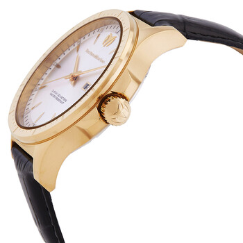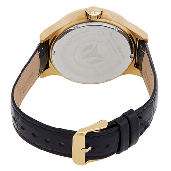 Gold-tone stainless steel case with a black leather strap. Fixed gold-tone stainless steel bezel. Silver-tone dial with gold-tone hands and index hour markers. Minute markers around the outer rim. Dial Type: Analog. Date display at the 3 o'clock position. PC32 quartz movement. Scratch resistant mineral crystal. Pull / push crown. Solid case back. Round case shape, case size: 45 mm, case thickness: 11.00 mm. Band width: 20 mm, band length: 8.50 inches. Buckle clasp. Water resistant at 30 meters / 100 feet. Functions: date, hour, minute, second. Moonsun Series. Casual watch style. Watch label: Japan Movt. Technomarine MoonSun Date Quartz Silver Dial Men's Watch TM-822013.