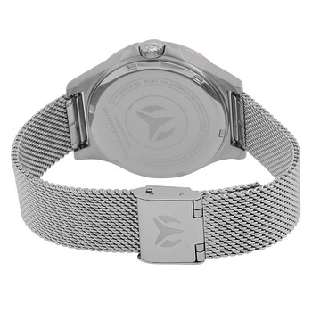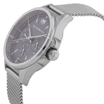 Silver-tone stainless steel case with a silver-tone stainless steel mesh bracelet. Fixed silver-tone stainless steel bezel. Charcoal dial with silver-tone hands and index hour markers. Minute markers around the outer rim. Dial Type: Analog. Date display at the 3 o'clock position. Three sub-dials displaying: date, day and 24 hour. VH63 quartz movement. Scratch resistant mineral crystal. Pull / push crown. Solid case back. Round case shape, case size: 36 mm, case thickness: 10.00 mm. Band width: 16 mm, band length: 7.75 inches. Fold over clasp. Water resistant at 30 meters / 100 feet. Functions: date, day, second time zone, hour, minute, second. Moonsun Series. Casual watch style. Watch label: Japan Movt. Technomarine MoonSun Date-Day Quartz Charcoal Dial Ladies Watch TM-822048.