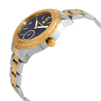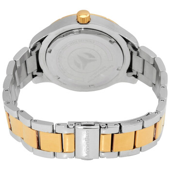 Stainless steel case with a two-tone (silver-tone and yellow gold-tone) stainless steel bracelet. Fixed yellow gold-tone bezel. Blue dial with luminous yellow gold-tone hands and index hour markers. Arabic numerals appear at the 3, 9 and 12 o'cclock positions. Minute markers around the outer rim. Dial Type: Analog. Luminescent hands. Small seconds sub-dial. TMI caliber VD78 quartz movement. Scratch resistant Flame Fusion crystal. Pull / push crown. Solid case back. Round case shape. Case size: 42 mm. Case thickness: 11 mm. Band width: 18 mm, band length: 7.25 inches. Fold over clasp. Water resistant at 50 meters / 165 feet. Functions: hour, minute, small second. Moonsun Series. Casual watch style. Watch label: Japan Movt. Technomarine MoonSun Quartz Blue Dial Men's Watch TM-818000.