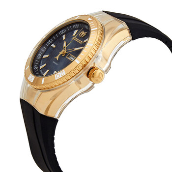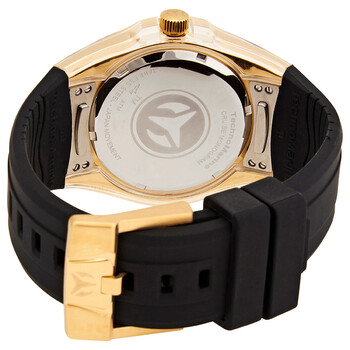 Gold-tone stainless steel case with a black silicone strap. Uni-directional rotating gold-tone bezel. Black dial with luminous gold-tone hands and index hour markers. Arabic numeral minute markers (at 5 minute intervals). Minute markers around the outer rim. Dial Type: Analog. Luminescent hands and markers. Day of the week and date display at the 3 o'clock position. Hattori caliber PC33 quartz movement. Scratch resistant Flame Fusion crystal. Screw down crown. Solid case back. Round case shape. Case size: 45 mm. Case thickness: 13 mm. Band width: 29 mm. Band length: 7.75 inches. Tang clasp. Water resistant at 200 meters / 660 feet. Functions: date, day, hour, minute, second. Cruise Series. Dive watch style. Watch label: Japan Movt. Technomarine Quartz Black Dial Men's Watch TM-115374.