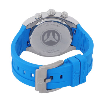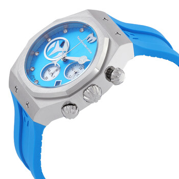 Silver-tone stainless steel case with a sky blue silicone strap. Silver-tone stainless steel bezel. Sky blue and silver dial with silver-tone hands and index hour markers. Minute markers around the outer rim. Dial Type: Analog. Luminescent hands and markers. Date display between 4 and 5 o'clock position. Chronograph - three sub-dials displaying: 60 second, 60 minute and 24 hour. Hattori Caliber VD53 quartz movement. Scratch resistant mineral crystal. Screw down crown. Solid case back. Round case shape, case size: 40 mm. Band width: 27 mm, band length: 8.25 inches. Buckle clasp. Water resistant at 200 meters / 660 feet. Functions: chronograph, date, GMT, second time zone, hour, minute, second. Reef Series. Sport watch style. Watch label: Japan Movt. Technomarine Reef Chronograph GMT Quartz Unisex Watch TM-523006.