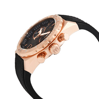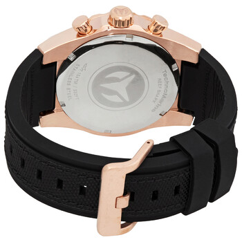 Rose gold-tone stainless steel case with a black silicone strap with a black nylon top. Uni-directional rotating rose gold-tone bezel. Black dial with luminous rose gold-tone hands and index hour markers. Minute markers around the outer rim. Dial Type: Analog. Luminescent hands. Date display above the 6 o'clock position. Chronograph - two sub-dials displaying: 60 second and 30 minute. Ronda caliber Z50 quartz movement. Scratch resistant Flame Fusion crystal. Pull / push crown. Solid case back. Round case shape. Case size: 48 mm. Case thickness: 14.1 mm. Band width: 28 mm. Band length: 8.75 inches. Tang clasp. Water resistant at 100 meters / 330 feet. Functions: chronograph, date, hour, minute, second. Reef Series. Sport watch style. Watch label: Swiss Movt. Technomarine Reef Chronograph Quartz Black Dial Men's Watch TM-519011.