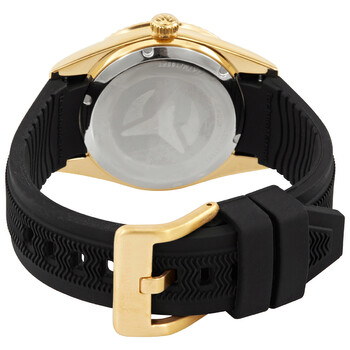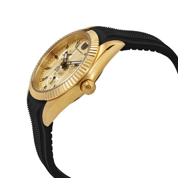 Gold-tone stainless steel case with a black silicone strap. Fixed fluted gold-tone bezel. Gold dial with luminous black hands and index hour markers. Minute markers around the outer rim. Dial Type: Analog. Luminescent hands. Three multi-function sub-dials displaying: date, day of the week and 24 hour. Caliber VH68 quartz movement. Scratch resistant mineral crystal. Pull / push crown. Solid case back. Round case shape. Case size: 38 mm. Case thickness: 11.5 mm. Band width: 20 mm. Band length: 8 inches. Tang clasp. Water resistant at 50 meters / 165 feet. Functions: date, day, GMT, second time zone, hour, minute, second. Sea Dream Series. Sport watch style. Watch label: Japan Movt. Technomarine Sea Dream Quartz Gold Dial Ladies Watch TM-719031.