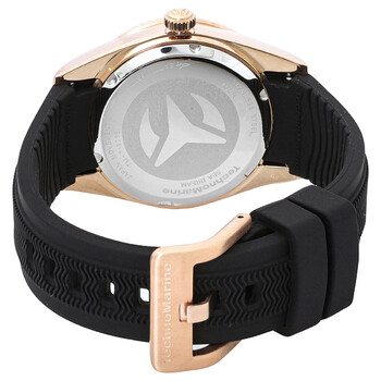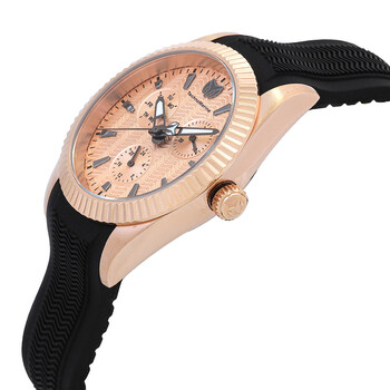 Rose gold-tone stainless steel case with a black silicone strap. Fixed rose gold-tone stainless steel bezel. Rose gold dial with black hands and index hour markers. Minute markers around the outer rim. Dial Type: Analog. Luminescent hands. Three sub-dials displaying: day,date and 24 hour. Quartz movement. Scratch resistant mineral crystal. Screw down crown. Solid case back. Round case shape, case size: 38 mm, case thickness: 11.5 mm. Band length: inches. Buckle clasp. Water resistant at 50 meters / 165 feet. Functions: hour, minute, second. Sport watch style. Watch label: Japan Movt. Technomarine Quartz Ladies Watch TM-719033.