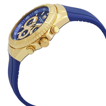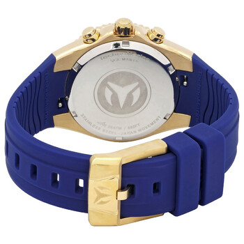 Gold-tone stainless steel case with a blue silicone strap. Uni-directional rotating gold-tone stainless steel bezel. Blue dial with gold-tone hands and index hour markers. Arabic numeral minute markers (at 5 minute intervals). Dial Type: Analog. Luminescent hands and markers. Chronograph - three sub-dials displaying: 60 second, 60 minute and 24 hour. Hattori Caliber VD54 quartz movement. Scratch resistant Flame Fusion crystal. Solid case back. Round case shape, case size: 40 mm. Band width: 26 mm. Tang clasp. Water resistant at 200 meters / 660 feet. Functions: chronograph, GMT, second time zone, hour, minute, second. Sea Manta Series. Sport watch style. Watch label: Japan Movt. TechnoMarine Sea Manta Chronograph GMT Quartz Blue Dial Unisex Watch TM-220079.