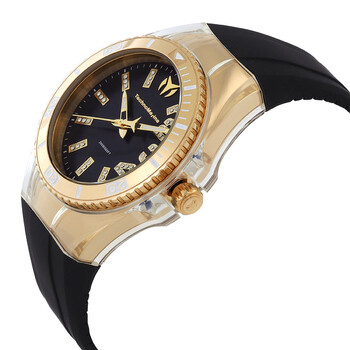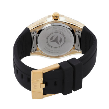 Gold-tone stainless steel case with a black silicone strap. Uni-directional rotating gold-tone stainless steel bezel. Black mother of pearl dial with gold-tone hands and index-Arabic numeral hour markers. Minute markers around the outer rim. Dial Type: Analog. Luminescent hands. TMI Caliber PC21J quartz movement. Scratch resistant Flame Fusion crystal. Pull / push crown. Solid case back. Round case shape, case size: 42 mm, case thickness: 13.1 mm. Band width: 29 mm, band length: 8.25 inches. Buckle clasp. Water resistant at 100 meters / 330 feet. Functions: hour, minute, second. Cruise Series. Casual watch style. Watch label: Japan Movt. Technomarine TechnoMarine Quartz Black Mother of Pearl Dial Men's Watch TM-121245.
