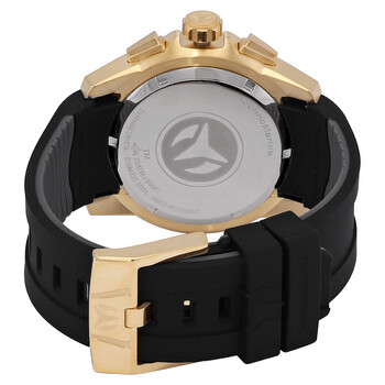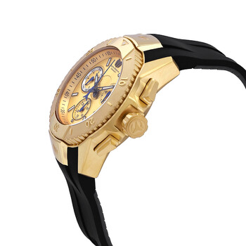 Yellow gold-tone stainless steel case with a black silicone strap. Uni-directional rotating yellow gold-tone bezel. Gold dial with luminous black hands and index hour markers. Arabic numeral minute markers (at 5 minute intervals). Minute markers around the outer rim. Dial Type: Analog. Luminescent hands and markers. Date display at the 4 o'clock position. Chronograph - two sub-dials displaying: 60 second and 30 minute. Day of the week sub-dial. Ronda caliber Z60 quartz movement. Scratch resistant mineral crystal. Screw down crown. Solid case back. Round case shape, case size: 48 mm, case thickness: 15.3 mm. Band width: 26 mm, band length: 8.25 inches. Fold over clasp with a safety release. Water resistant at 200 meters / 660 feet. Functions: chronograph, date, day, hour, minute, small second. Uf6 Series. Dive watch style. Watch label: Swiss Movt. Technomarine UF6 Chronograph Quartz Gold Dial Men's Watch TM-617001.