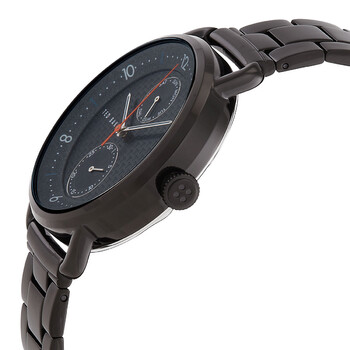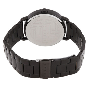 Black stainless steel case and bracelet. Fixed black stainless steel bezel. Black dial with silver-tone hands and index-Arabic numeral hour markers. Minute markers around the outer rim. Dial Type: Analog. Two sub-dials displaying: day and date. Quartz movement. Scratch resistant mineral crystal. Pull / push crown. Solid case back. Round case shape, case size: 42 mm. Deployment with push button release clasp. Water resistant at 50 meters / 165 feet. Functions: date, day, hour, minute, second. Brixam Series. Casual watch style. Watch label: Japan Movt. Item Variations: BKPBXF0109I. Ted Baker Brixam Quartz Black Dial Men's Watch BKPBXF010.