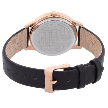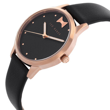 Rose gold-tone stainless steel case with a black leather strap. Fixed rose gold-tone stainless steel bezel. Black dial with rose gold-tone hands and index hour markers. Dial Type: Analog. Quartz movement. Scratch resistant mineral crystal. Pull / push crown. Solid case back. Round case shape, case size: 34 mm. Buckle clasp. Water resistant at 50 meters / 165 feet. Functions: hour, minute, second. Fitzovia Bow Series. Casual watch style. Watch label: Japan Movt. Item Variations: BKPFZS1199I. Ted Baker Fitzovia Bow Quartz Black Dial Ladies Watch BKPFZS119.