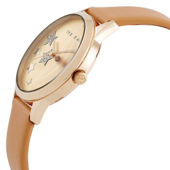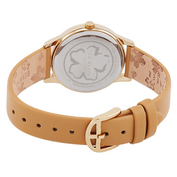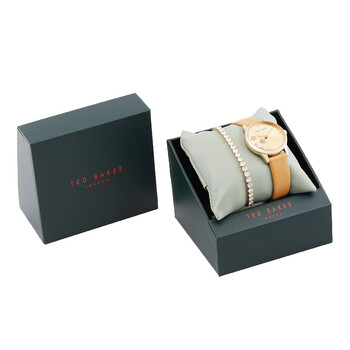 Gold-tone stainless steel case with a brown leather strap. Fixed gold-tone stainless steel bezel. Gold-tone dial with gold-tone hands. Dial Type: Analog. Quartz movement. Scratch resistant mineral crystal. Pull / push crown. Solid case back. Round case shape, case size: 34 mm, case thickness: 8.8 mm. Band width: 16 mm. Buckle clasp. Water resistant at 50 meters / 165 feet. Functions: hour, minute, second. Additional Info: ted baker's icon crystal bracelet included. Fitzrovia Classic Chic Series. Casual watch style. Watch label: Japan Movt. Ted Baker Fitzrovia Classic Chic Quartz Gold Dial Ladies Watch and Bracelet Set BKGFW22199I.