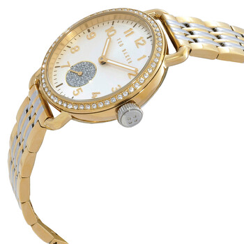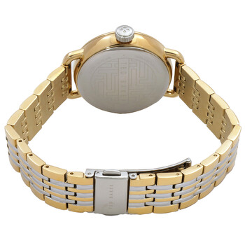 Gold-tone stainless steel case with a two-tone (silver-tone and gold-tone) stainless steel bracelet. Fixed gold-tone bezel with stainless steel crystal set. Silver dial with gold-tone hands and Arabic numeral hour markers. Dial Type: Analog. Luminescent hands. Quartz movement. Scratch resistant mineral crystal. Pull / push crown. Solid case back. Round case shape, case size: 35 mm, case thickness: 9 mm. Band width: 14 mm. Fold over clasp with a safety release. Water resistant at 50 meters / 165 feet. Functions: hour, minute, second. Hannah Series. Sport watch style. Watch label: Japan Movt. Ted Baker Hannah Quartz Crystal Silver Dial Ladies Watch BKPHHF106.