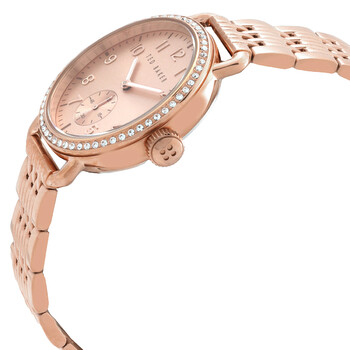 Rose gold-tone ceramic case with a rose gold-tone stainless steel bracelet. Fixed rose gold-tone stainless steel bezel. Rose gold-tone dial with rose gold-tone hands and Arabic numeral hour markers. Dial Type: Analog. Luminescent hands. One-small seconds subdials. Quartz movement. Scratch resistant mineral crystal. Pull / push crown. Solid case back. Round case shape, case size: 43 mm. Deployment with push button release clasp. Water resistant at 30 meters / 100 feet. Functions: hour, minute, second. Hannah Series. Casual watch style. Watch label: Japan Movt. Ted Baker Hannah Quartz Rose Gold Dial Men's Watch BKPHHS001.